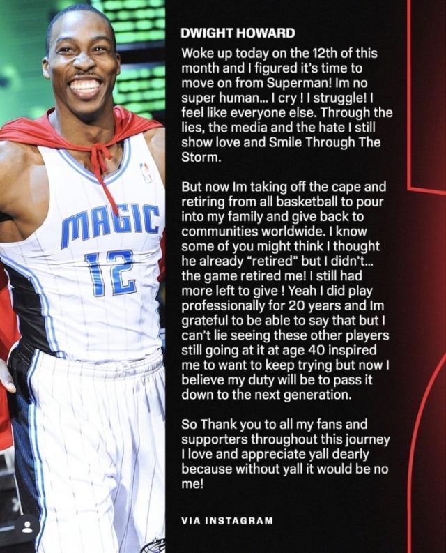 北京时间3月13日,NBA传奇中锋德怀特·霍华德在个人社交媒体发布长文,正式宣布结束长达20年的职业篮球生涯。这位曾以"魔兽"之名震撼联盟的球员,用充满情感的文字向篮球世界道别...